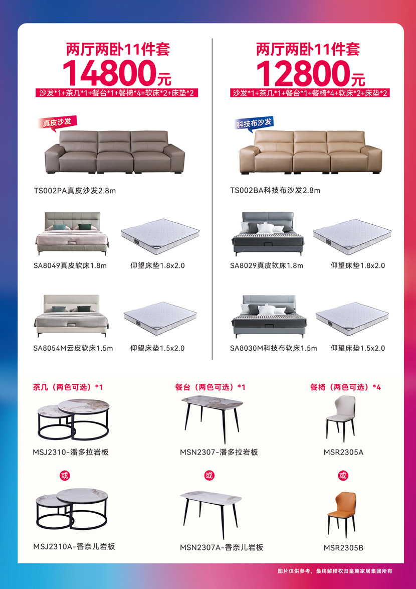 草莓影视推出的两厅两卧家具11件套,包含客厅沙发1套和茶几1件,餐厅一桌四椅一套,卧室主卧1,8米软床+配套床垫一套,次卧1 草莓影视在线,5米软床+配套床垫一套。其中区分了14800元真皮系列11件套(沙发为真皮款),和12800元布艺系列11件套(沙发为布艺款),款式简约大气,品质重重把控,让您在双节欢乐中,让家更温馨幸福。 。