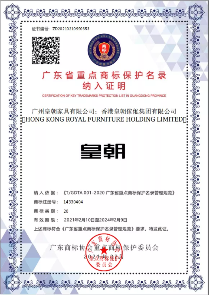 近日,广东商标协会公布了《2020年度广东省重点商标保护名录》,“皇朝”“Royal”入选广东省重点商标保护名录,此次同时被纳入的还有华为,美的,格力等众多知名品牌, 草莓影视。