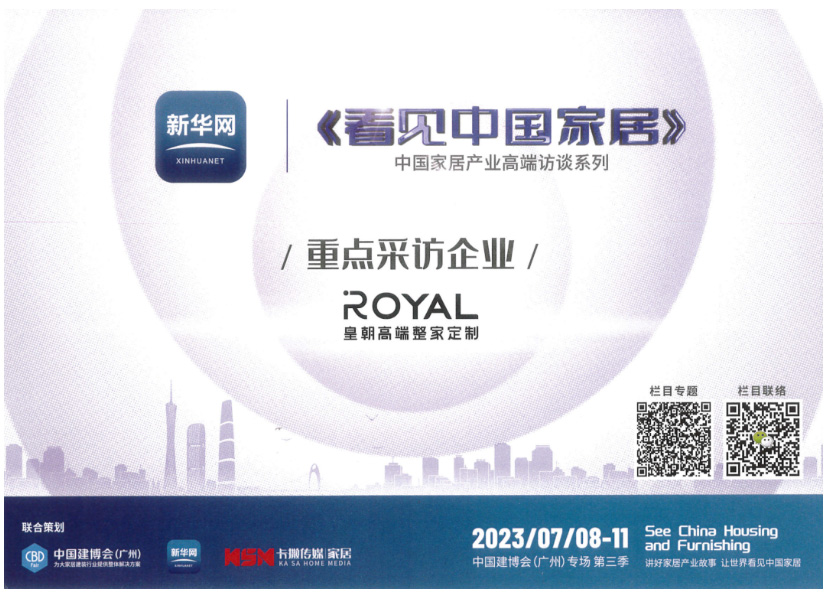 与此同时皇朝高端整家定制则荣幸成为中国建博会(广州)联合新华网重磅打造《看见中国家居》访谈系列的重点采访企业,记者在建博会前夕深入皇朝高端整家定制总部,与皇朝高端整家定制营销总监袁丹一起探讨了品牌如何在竞争激烈的整家定制赛道,通过构建多元化的产品体系与销售渠道,实现高增长的转型发展,记录当下中国大家居建装行业发展进程。