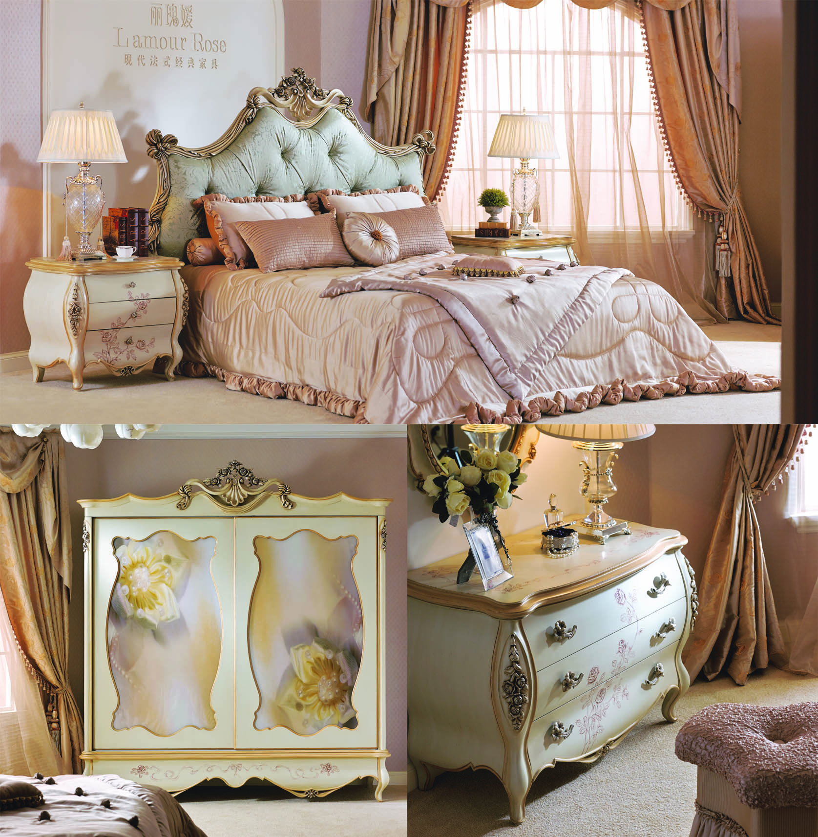 卧房以玫瑰与飘带形为主题元素进行构思设计,精美绝伦的玫瑰花代表着永恒的经典爱情 草莓影视高清,东方舞女水袖般灵动,飘逸,洒脱的飘带,让整款床仿佛瞬间伴随优美的巴洛克圆舞曲翩跹起舞,顿时有了生机,灵气外露,顷刻间又仿佛化身法兰西美丽的女神,向你述说着那一段年代久远的浪漫动人爱情故事…… .