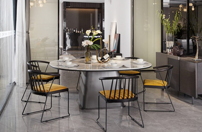 将芥末黄用在金属餐椅的坐垫上,一室黑白灰静谧中,这抹明朗而不刺眼的黄色有一种安抚情绪、增加愉悦值的魔力,疲惫时总是能被这明朗的色调所温暖到,感觉一天的工作都有了元气。