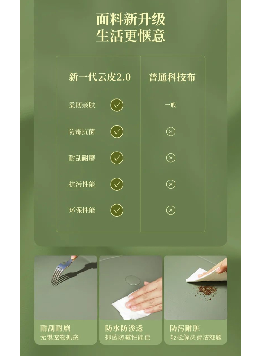 材质:云皮2.0环保面料、全实木框架、皇朝专研高密度高回弹海绵