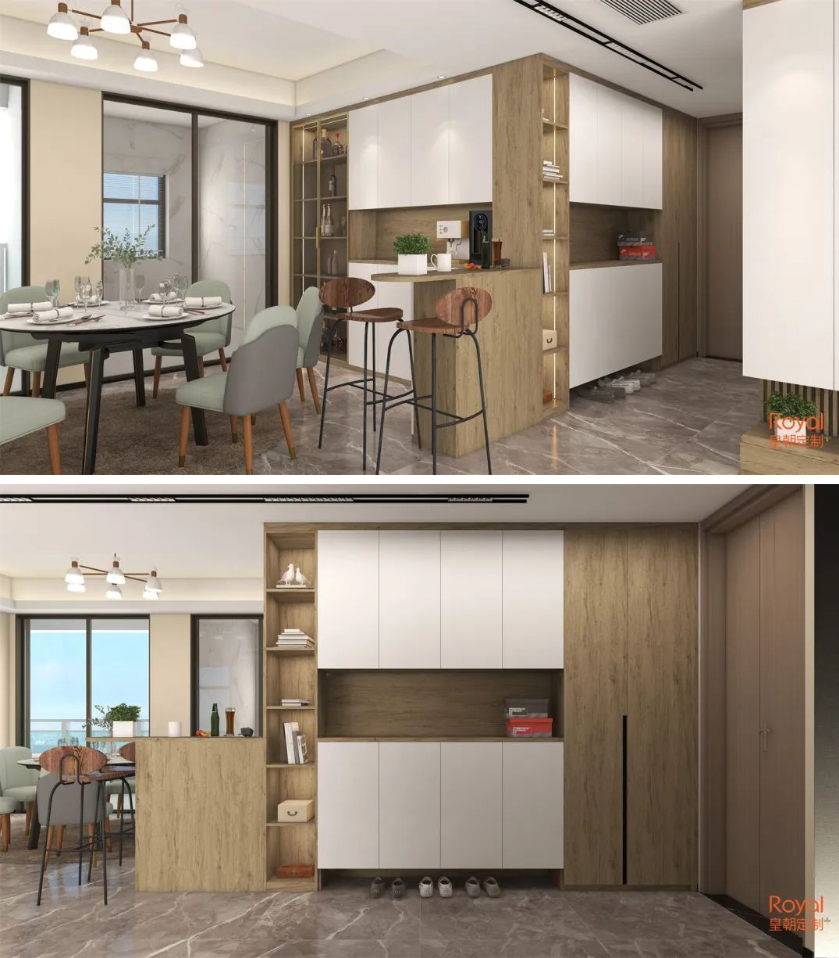 餐边柜延伸出来的小吧台,自是一处休闲好天地。同色设计的玄关鞋柜与餐边柜连成一片,功能藏纳其中,尤显和谐。