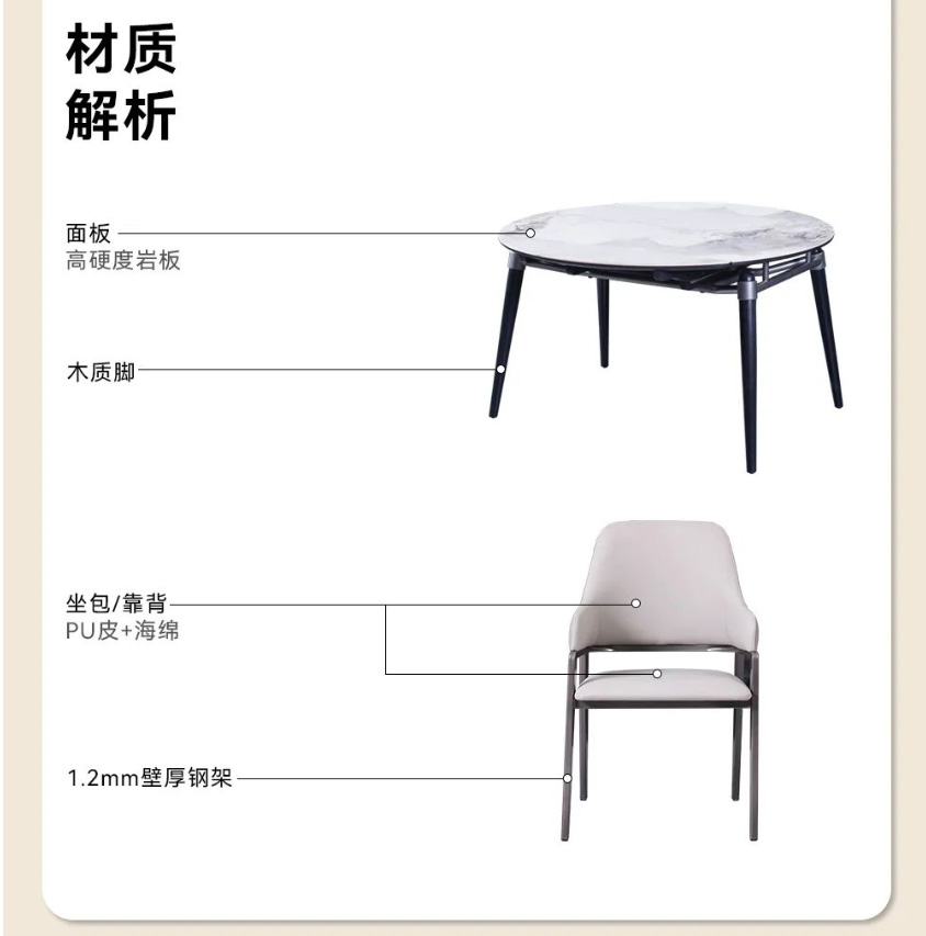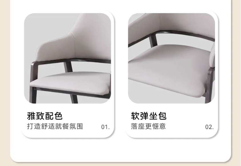 户型餐桌要怎么选才能既省空间又不失美感?MSN2206可伸缩餐桌,简直是小户型的福音!可拉伸的设计,让它可以根据不同场景变换不同的形态,用餐人少时方桌占地少,人多时只需将两侧的半月板拉出,秒变大气圆桌,再多的美味佳肴也放得下!台面选用了香奈儿岩板,纹理写意,淡雅素净;同时,它还具备耐刮磨耐高温高密度食品级别安全等优点,高颜值性能出众。木质导轨质感十足,推拉静音无卡顿,而且还会越用越顺滑;同时桌脚采用了八字斜角设计,视觉上美观通透,日常满足餐椅收纳,打扫卫生也很省心。就餐想要更有仪式感,那就少不了米奢这款雅致餐椅。环抱舒适靠背和宽大海绵座包,落座更惬意,吃饭也更香了!这样舒适与自在的餐厅,真的很难不心动!