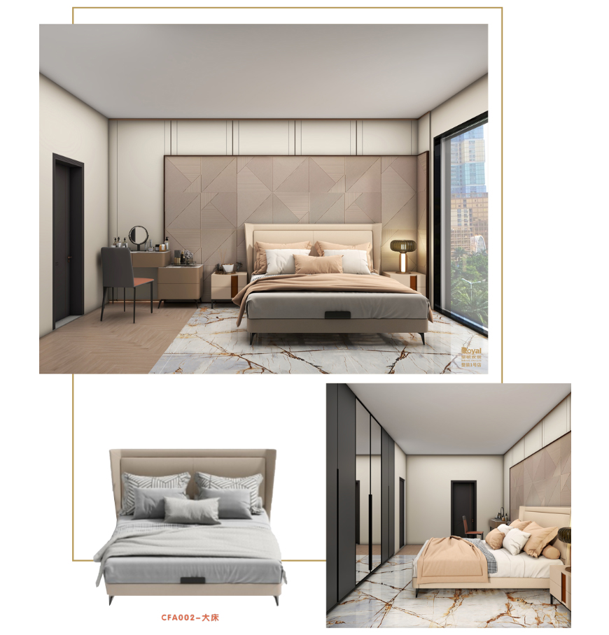 卧室,一个令人心醉、放松的舒适空间。柔和的灯光氛围让感受到一份宁静,让你自由的呼吸完全放松。从木纹地板到光滑的大理石地板,艺术自然几何条线设计的背景墙,每一寸的细节都散发出高品质的奢华感。暖色调的卧室家具配套,增加空间的舒适感。柔软的枕头被子让你可以沉浸在梦幻般的世界中,让每一个夜晚都成为一次愉悦的旅程。