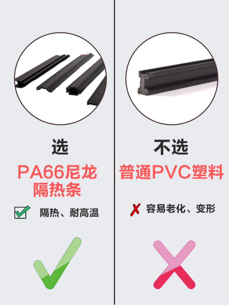 其次就是隔热条,它能阻断热量流通,起到隔冷隔热的作用,这个非常重要,记住不要选PVC,要选PA66的尼龙隔热条,这个东西是密封条。我们的汽车用的也是这种材质,寿命长,不容易老化。