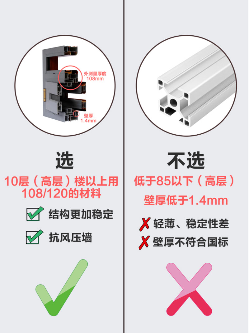 选框架材料的时候有两个尺寸也是需要注意的,一个是整体外测量的尺寸,十层楼以上建议用108mm/120mm的材料,楼层越高,风压就会越大,而我们选的型材体积越大,稳定性就会越好,十层以下的就用90/85/80mm的尺寸就可以了,而且还便宜。